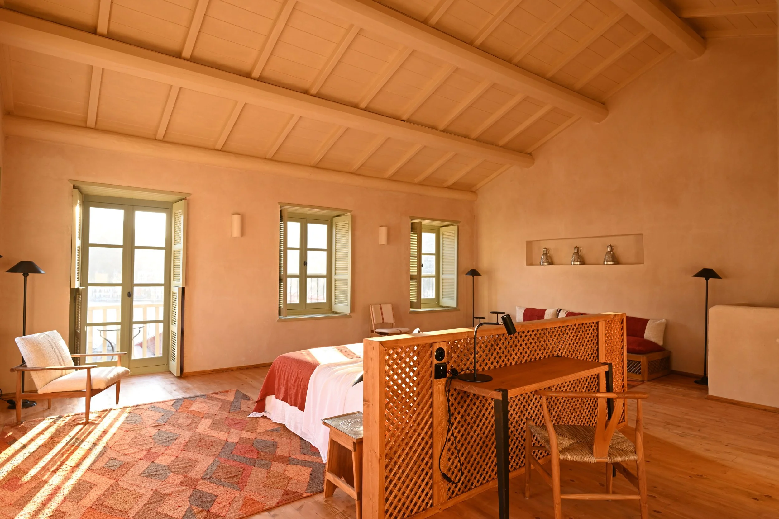 Spanning 55m², the Hamra Suite features a furnished balcony and a sitting area with a sofa and desk. Styled with warm terracotta tones and vintage accents, it offers a double bed and a bathroom with a walk-in shower, ideal for up to two guests.